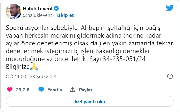 Kahramanmaraş merkezli depremlerin ardından yardım ve bağış toplama çalışmaları nedeniyle hedef gösterilen Ahbap Derneği’nin kurucusu ve sabatçı Haluk Levent, AHBAP’ın denetlenmesi için İçişleri Bakanlığı’na başvuruda bulunduklarını duyurdu.