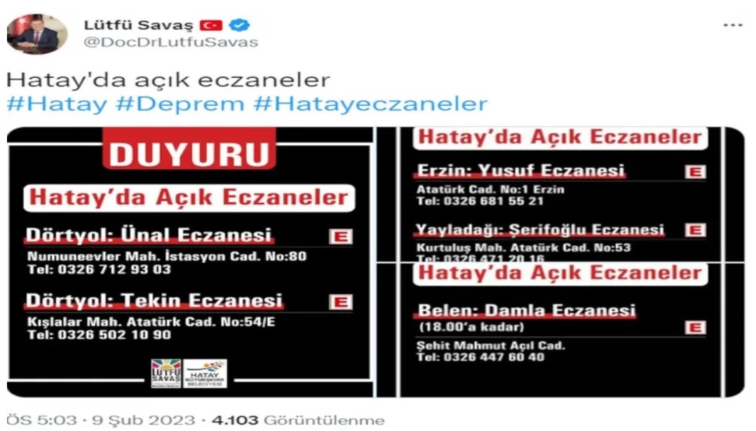 Hatay Belediye Başkanı Lütfü Savaş Twitter hesabı üzerinden şehirdeki açık eczaneleri duyurdu.