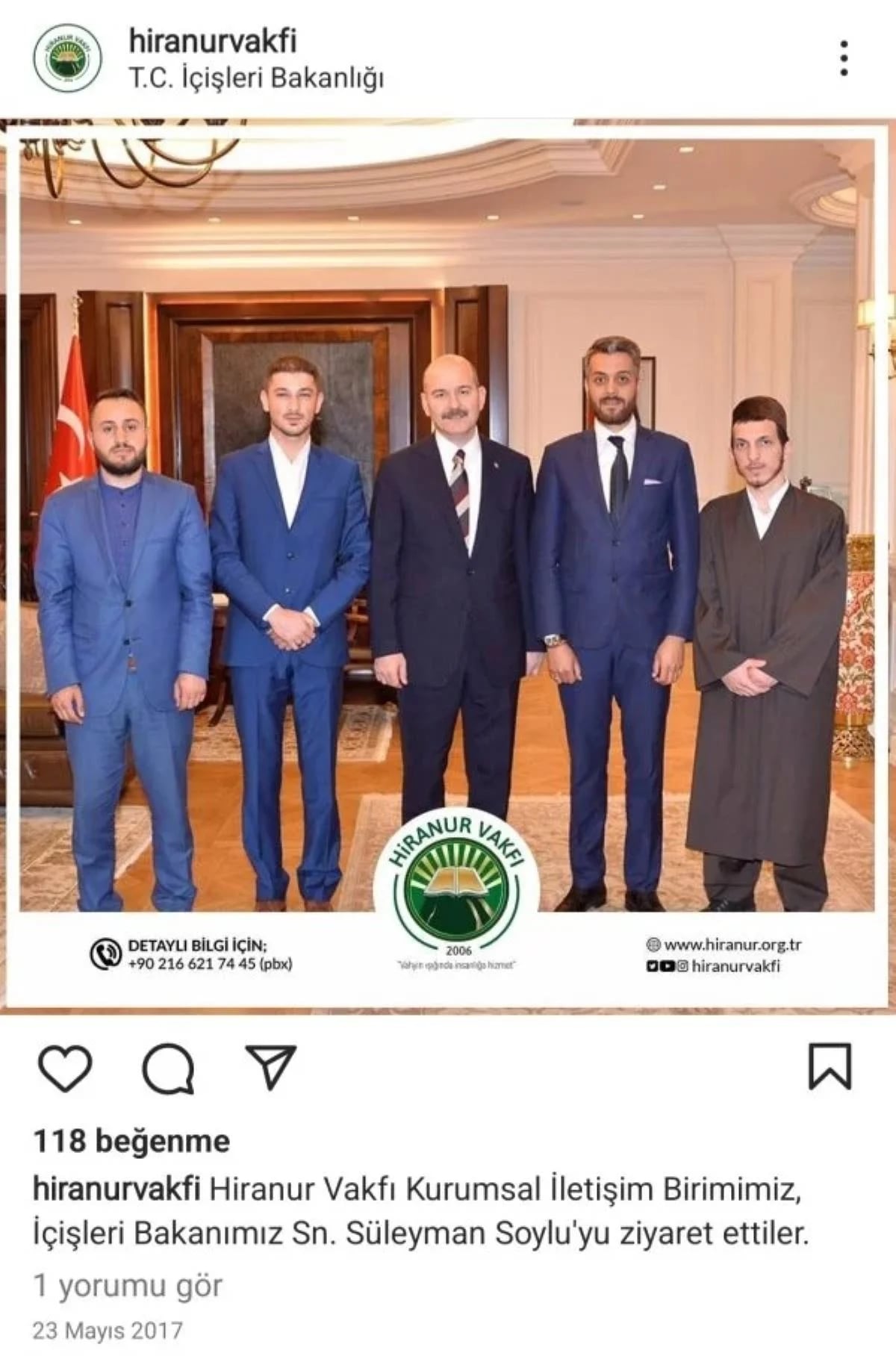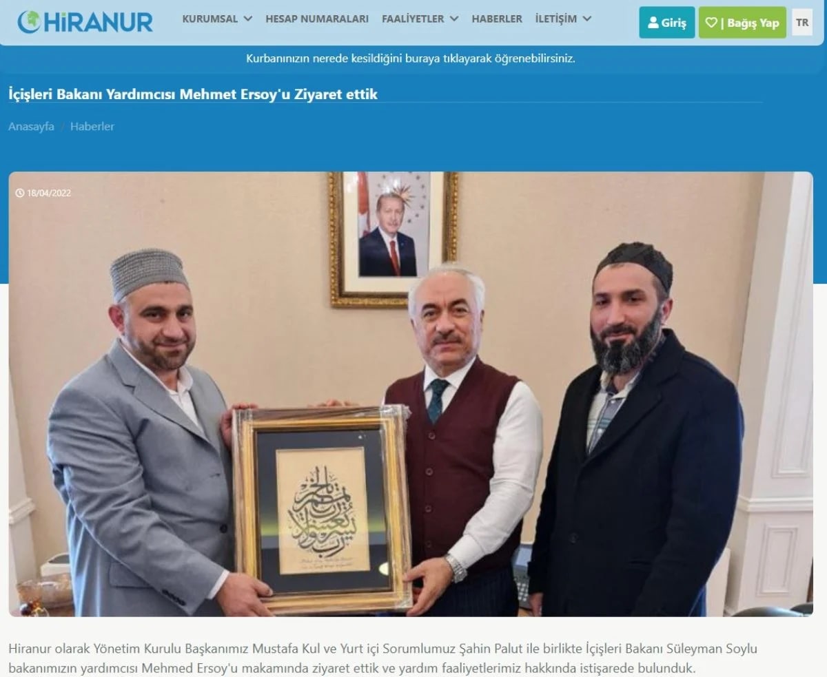 Söz konusu ziyaret, vakıf tarafından “Hiranur olarak Yönetim Kurulu Başkanımız Mustafa Kul ve Yurtiçi Sorumlumuz Şahin Palut ile birlikte İçişleri Bakanı Süleyman Soylu bakanımızın yardımcısı Mehmed Ersoy’u makamında ziyaret ettik” sözleriyle paylaşıldı.