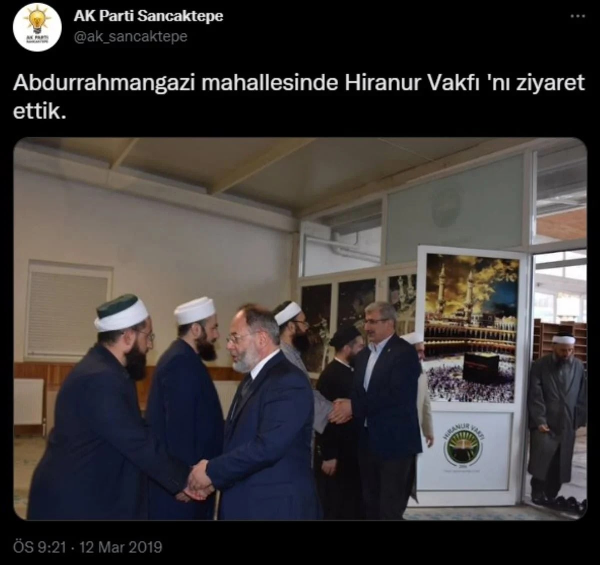 AKP İstanbul Milletvekili Mustafa Ataş’ın da “Sancaktepe’de faaliyet gösteren Hiranur Vakfı’nı ziyaret ettik. Yaptıkları hizmetler için teşekkür ettik” paylaşımı ortaya çıktı.