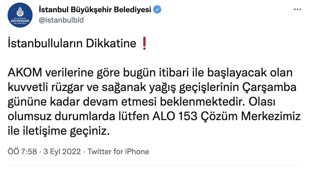“AKOM verilerine göre bugün itibari ile başlayacak olan kuvvetli rüzgar ve sağanak yağış geçişlerinin Çarşamba gününe kadar devam etmesi beklenmektedir. Olası olumsuz durumlarda lütfen ALO 153 Çözüm Merkezimiz ile iletişime geçiniz.”