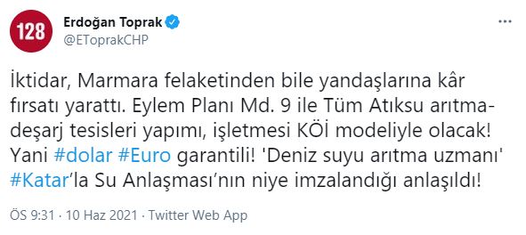 “Eylem Planı Md. 9 ile Tüm Atıksu arıtma-deşarj tesisleri yapımı, işletmesi KÖİ modeliyle olacak. Yani dolar Euro garantili” iddiasında bulunan Erdoğan Toprak, “‘Deniz suyu arıtma uzmanı’ Katar’la Su Anlaşması’nın niye imzalandığı anlaşıldı” dedi.