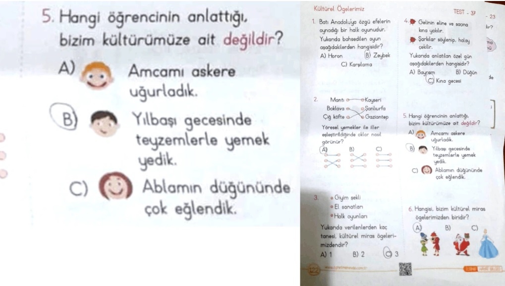 Bahsi geçen sorudan bir öncesinde çocuklara evlilikten önceki kına gecesinin ne olduğu öğretilirken, bir sonrakinde ise şekilli anlatımla Noel Baba’nın kültürel miras öğelerimizde yer alamayacağı kanıksatılmaya çalışıldı.
