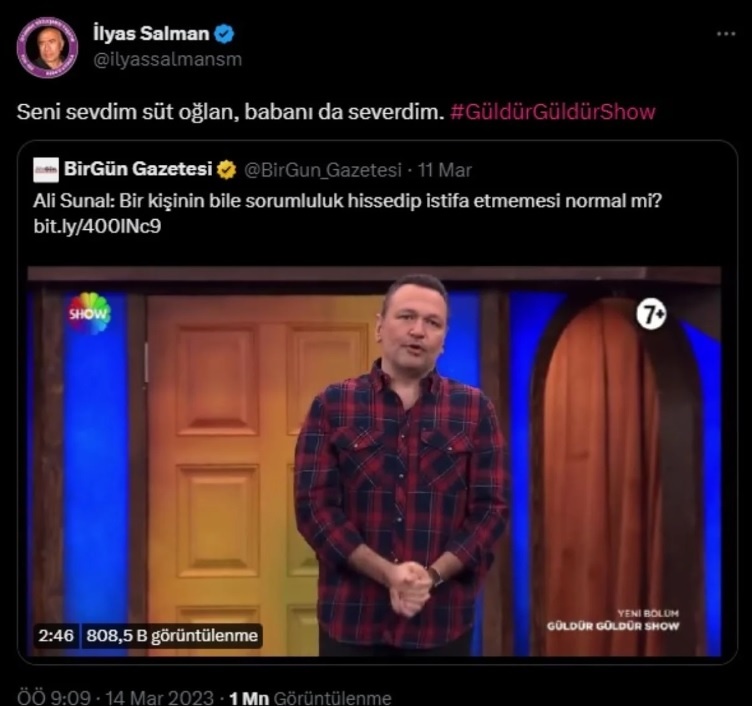 Ali Sunal’ın depremle ilgili konuştuğu videoyu Twitter hesabından yayımlayan İlyas Salman, Kemal Sunal’ın Süt Oğlan filmine atıfta bulundu.