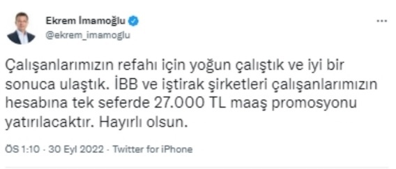 “Çalışanlarımızın refahı için yoğun çalıştık ve iyi bir sonuca ulaştık. İBB ve iştirak şirketleri çalışanlarımızın hesabına tek seferde 27.000 TL maaş promosyonu yatırılacaktır. Hayırlı olsun.”