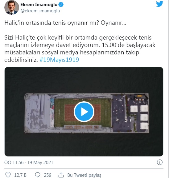 “Haliç’in ortasında tenis oynanır mı? Oynanır… Sizi Haliç’te çok keyifli bir ortamda gerçekleşecek tenis maçlarını izlemeye davet ediyorum. 15.00’de başlayacak müsabakaları sosyal medya hesaplarımızdan takip edebilirsiniz.”