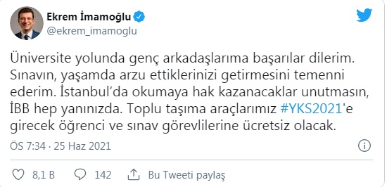 İmamoğlu, Twitter’dan yaptığı açıklamada, “Üniversite yolunda genç arkadaşlarıma başarılar dilerim. Sınavın, yaşamda arzu ettiklerinizi getirmesini temenni ederim. İstanbul’da okumaya hak kazanacaklar unutmasın, İBB hep yanınızda. Toplu taşıma araçlarımız #YKS2021’e girecek öğrenci ve sınav görevlilerine ücretsiz olacak” ifadelerini kullandı.