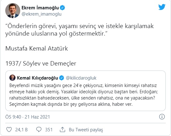 İmamoğlu daha sonra ise CHP lideri Kemal Kılıçdaroğlu’nun konuyla ilgili attığı tweeti alıntılayarak şu ifadeleri kullandı: