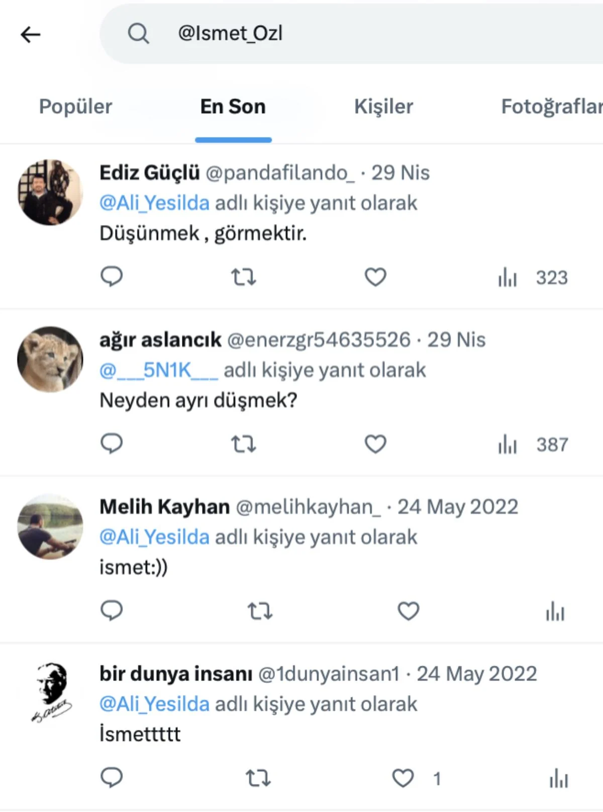 * Ali_Yesilda Twitter’a @Ismet_Ozl adıyla Nisan 2022’de katıldı. Biraz takipçi topladıktan sonra Psikolog Ayşe Minyeli Hanım olmaya karar verdi.