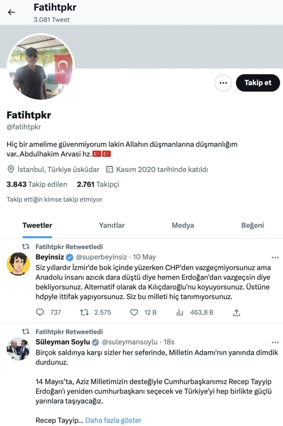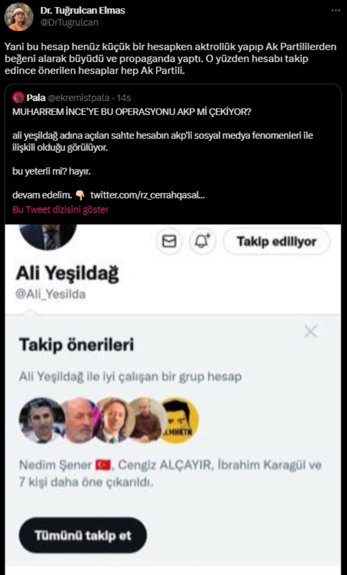 * Yani bu hesap henüz küçük bir hesapken aktrollük yapıp Ak Partililerden beğeni alarak büyüdü ve propaganda yaptı. O yüzden hesabı takip edince önerilen hesaplar hep Ak Partili.