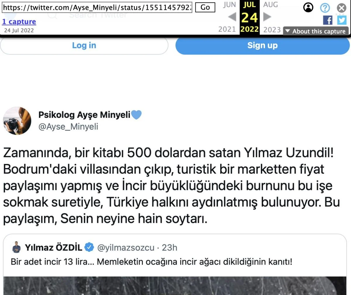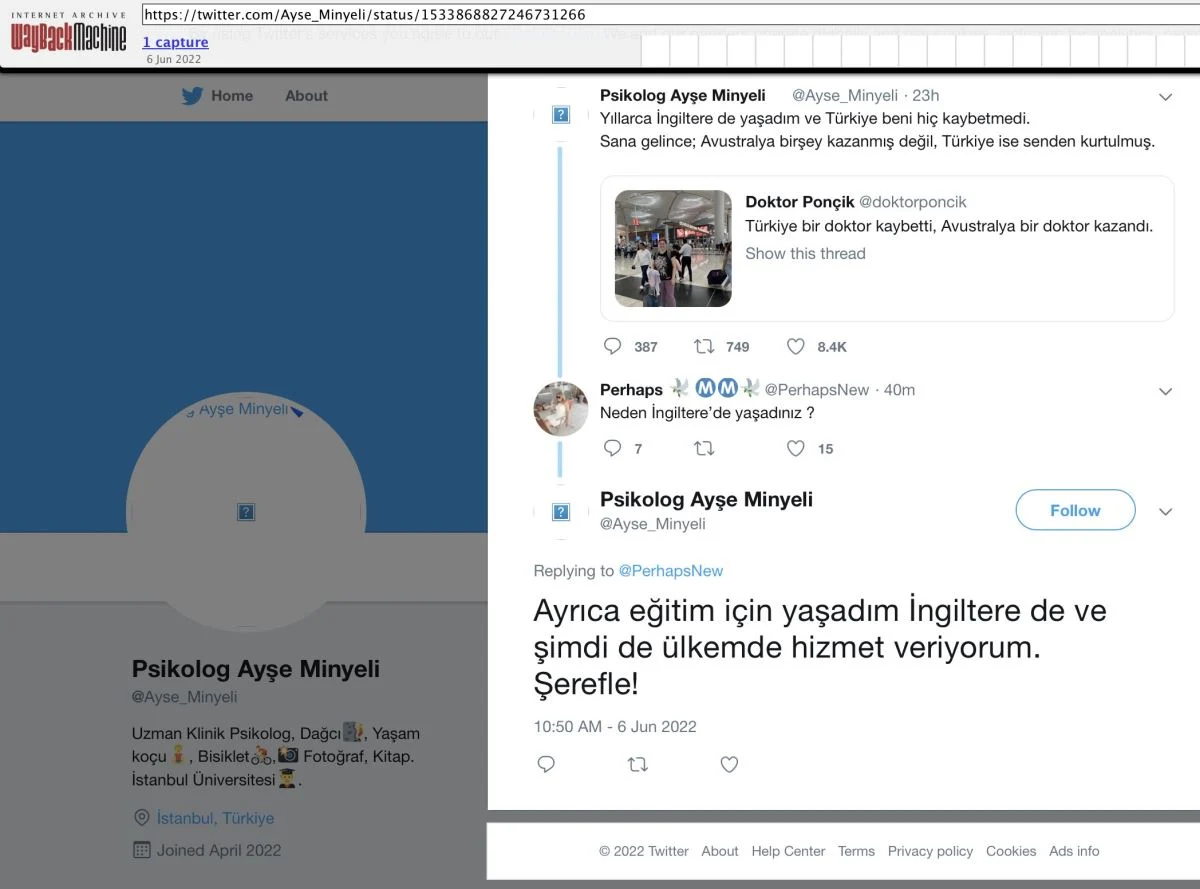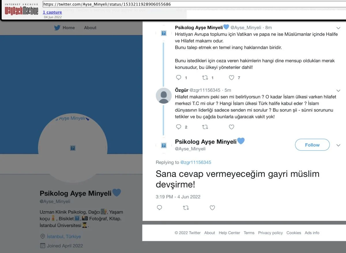 Hesabın, ID değiştirmeden önce Ayşe Minyeli adıyla tweet attığı dönemde 6284’ün kaldırılmasını istediği, Atatürk aleyhine tweet atıp Cumhurbaşkanı Erdoğan’ı övdüğü, hilafeti savunduğu, Ümit Özdağ ve Nevşin Mengü’ye hakaret ettiği görüldü.