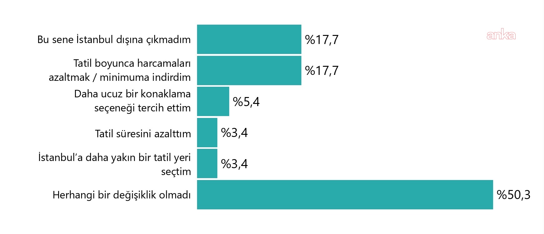 Araştırma kapsamında Ramazan Bayramı tatiline ilişkin sorular da yöneltildi. Katılımcıların yüzde 50,3’ü bayram tatiline ilişkin planlarında herhangi bir değişiklik yapmadığını ifade etti. Genellikle bayram tatillerini İstanbul dışında geçirdiğini belirten katılımcıların yüzde 17,7’si ise bu yıl ekonomik sebeplerle şehir dışına çıkamadığını söyledi. Tatil boyunca harcamalarını kıstığını söyleyenlerin oranı da yüzde17,7 oldu.