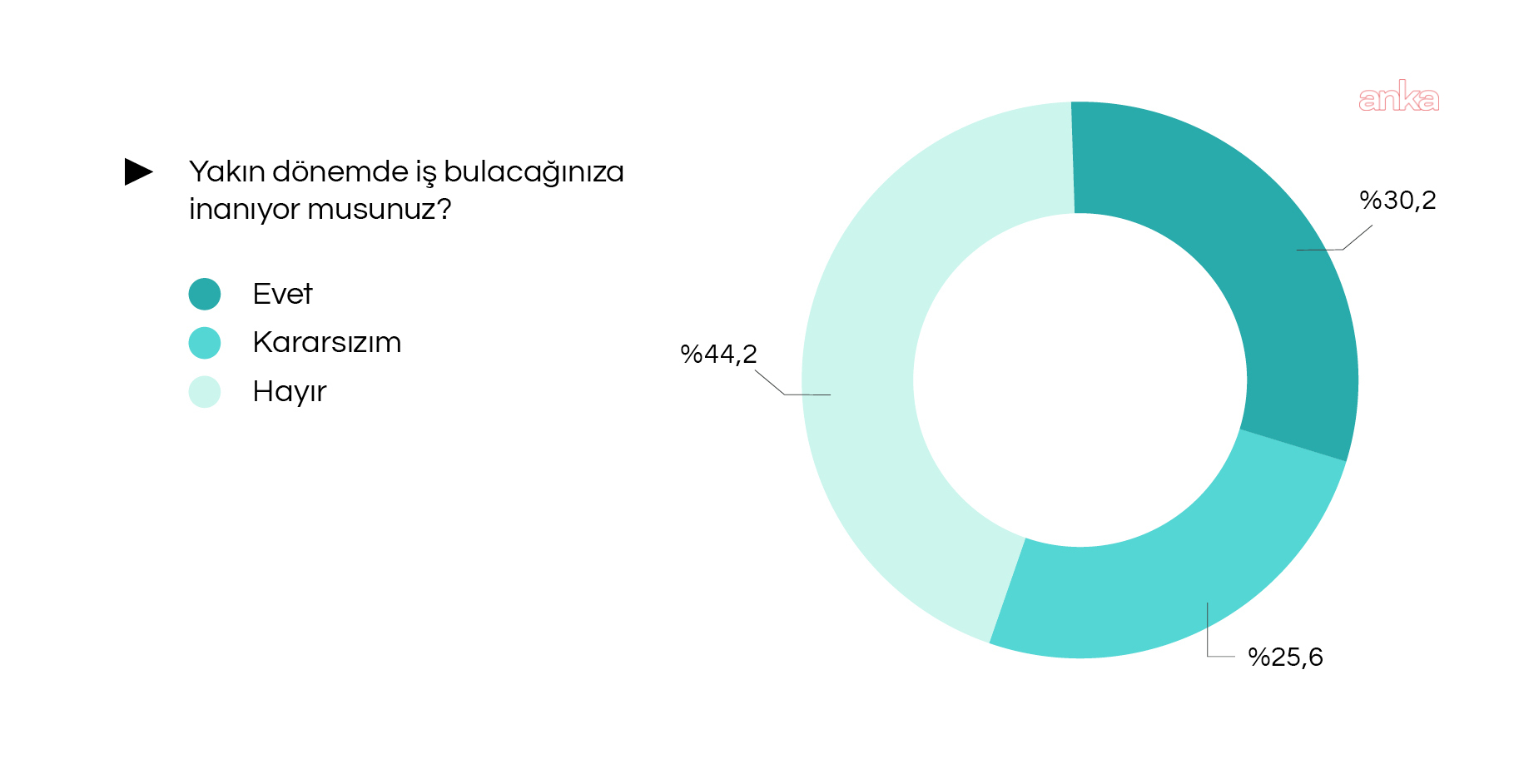 Araştırmada, öğrencilere ve iş arayan ama bulamadığını belirten katılımcılara “Yakın dönemde iş bulacağınıza inanıyor musunuz” sorusu yöneltildi. Katılımcıların yüzde 30,2’si yakın zamanda iş bulacağına inanırken, yüzde 25,6’sı kararsız olduğunu, yüzde 44,2’si ise iş bulacağına inanmadığını belirtti.