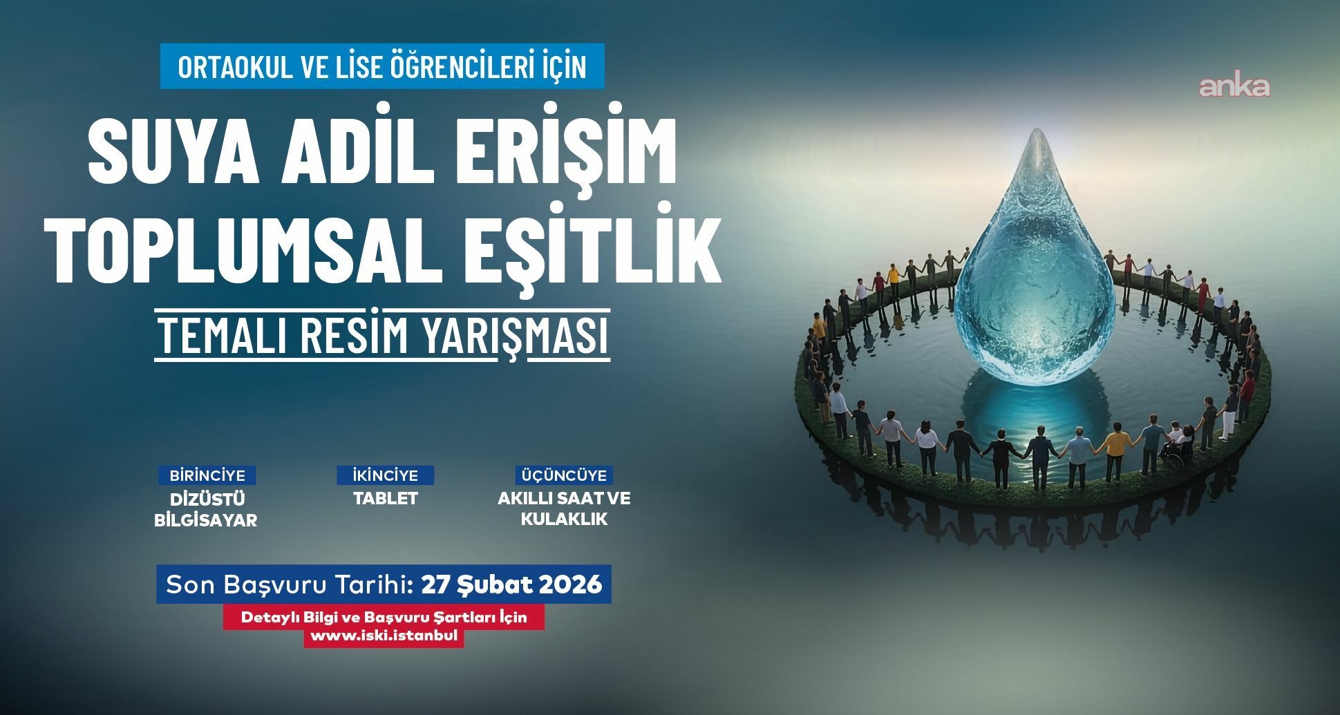 İstanbul Su ve Kanalizasyon İdaresi (İSKİ) Genel Müdürlüğü, 22 Mart Dünya Su Günü etkinlikleri kapsamında, su kaynaklarının korunması, su tasarrufunun önemi ve bilinçli su kullanımına dikkati çekmek amacıyla anlamlı bir yarışma düzenliyor. İSKİ tarafından İstanbul’da öğrenim gören ortaokul ve lise öğrencilerine yönelik olarak hazırlanan resim yarışması, “Suya Adil Erişim, Toplumsal Eşitlik” temasıyla gerçekleştirilecek.