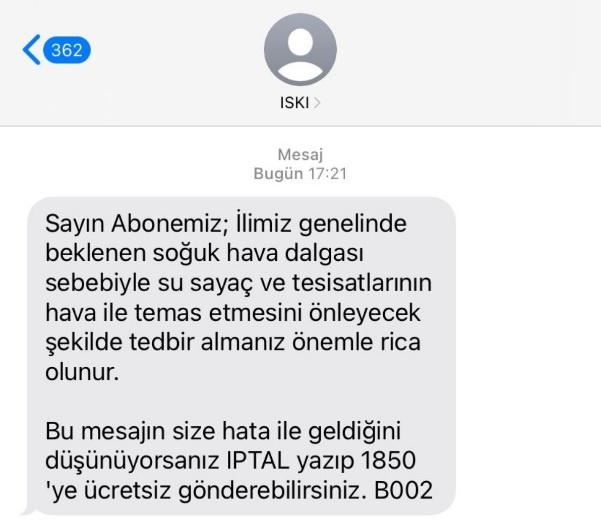 “Sayın abonemiz; ilimiz genelinde beklenen soğuk hava dalgası sebebiyle su sayaç ve tesisatlarının hava ile temas etmesini önleyecek şekilde tedbir almanız önemle rica olunur.”