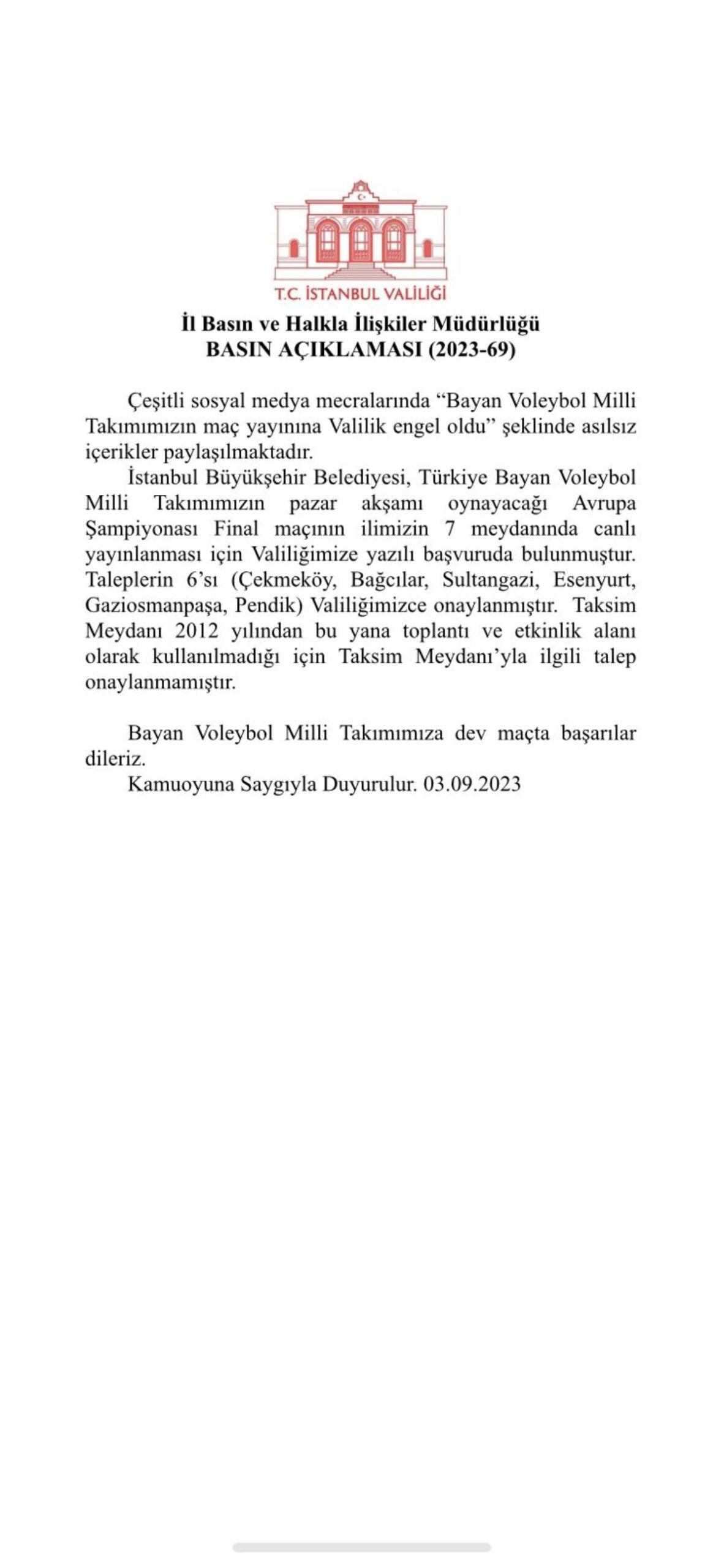 İstanbul Büyükşehir Belediyesi, Türkiye Bayan Voleybol Milli Takımımızın pazar akşamı oynayacağı Avrupa Şampiyonası Final maçının ilimizin 7 meydanında canlı yayınlanması için Valiliğimize yazılı başvuruda bulunmuştur. Taleplerin 6’sı (Çekmeköy, Bağcılar, Sultangazi, Esenyurt, Gaziosmanpaşa, Pendik) Valiliğimizce onaylanmıştır. Taksim Meydanı 2012 yılından bu yana toplantı ve etkinlik alanı olarak kullanılmadığı için Taksim Meydanı’yla ilgili talep onaylanmamıştır.
