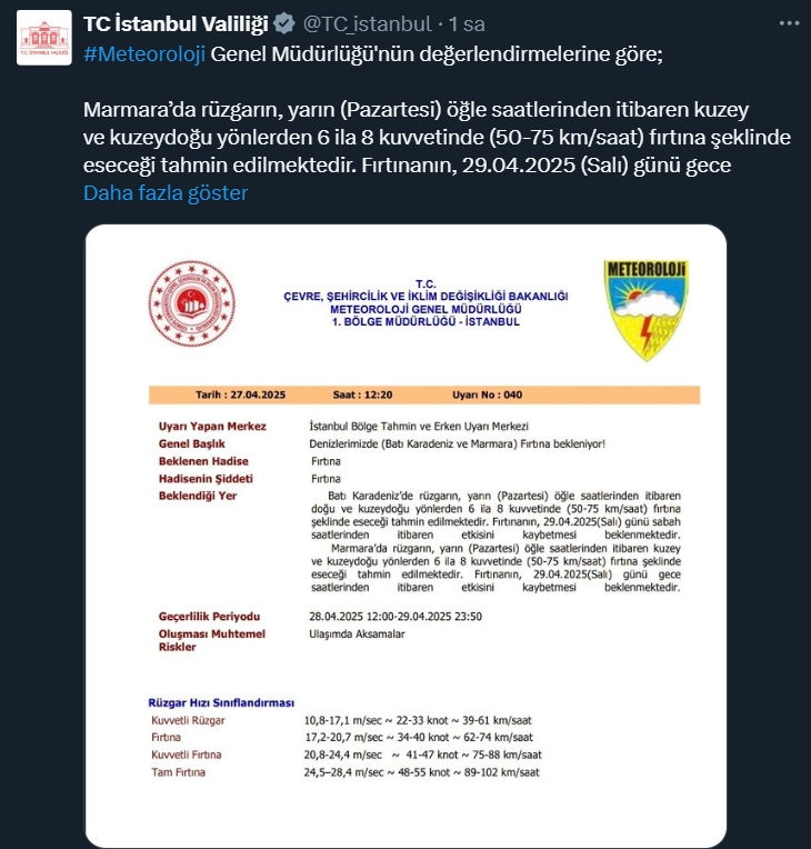 İstanbul Valiliği, bir uyarı notu yayımlayarak vatandaşları beklenen fırtınaya karşı uyardı. Valilik açıklamasında fırtınanın yarın öğle saatlerinden itibaren etkili olmasının beklendiği kaydedildi.