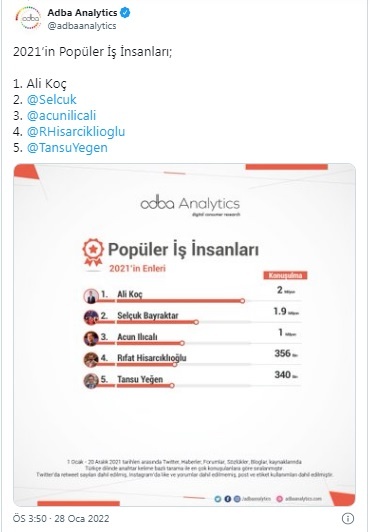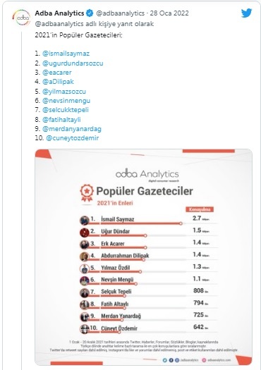 Sosyal veri analizi şirketi Adba Analytics tarafından açıklanan Sosyal medyada 2021’nin en çok konuşulanları listesinde 2021’in en popüler gazetecileri kategorisi de yer aldı.