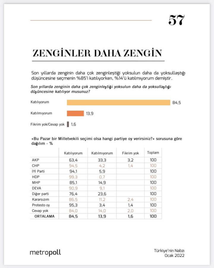Sosyal medya hesabından açıklama yapan Sencar, anketin sonuçlarına göre; Yurttaşların yüzde 85’i zenginin daha çok zenginleştiğini yoksulun da daha da yoksullaştığını düşünüyor.