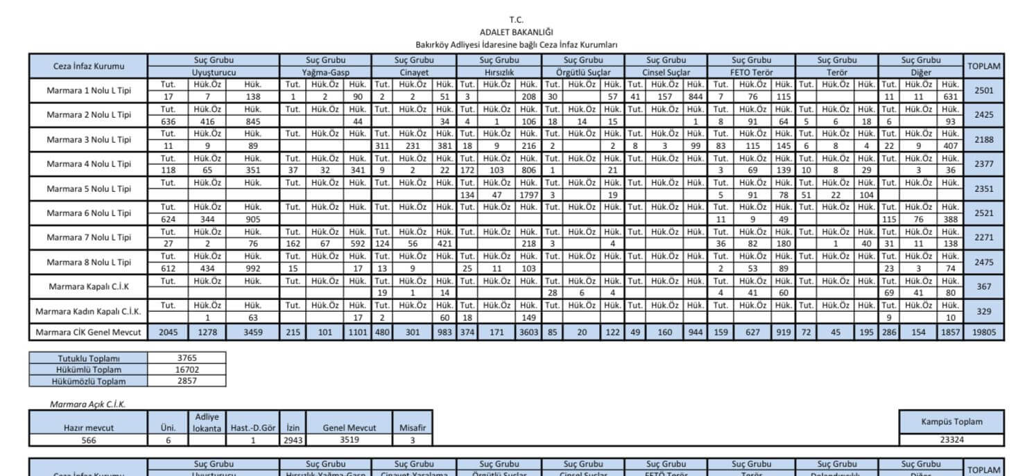 Hemen hemen her gün Türkiye’deki suç işleme oranları tartışılırken, Adalet Bakanlığı Bakırköy Adliyesi’ne bağlı cezaevlerinin tutuklu/ hükümlü sayısına ve suçlu profillerini içeren veriler ortaya çıktı.