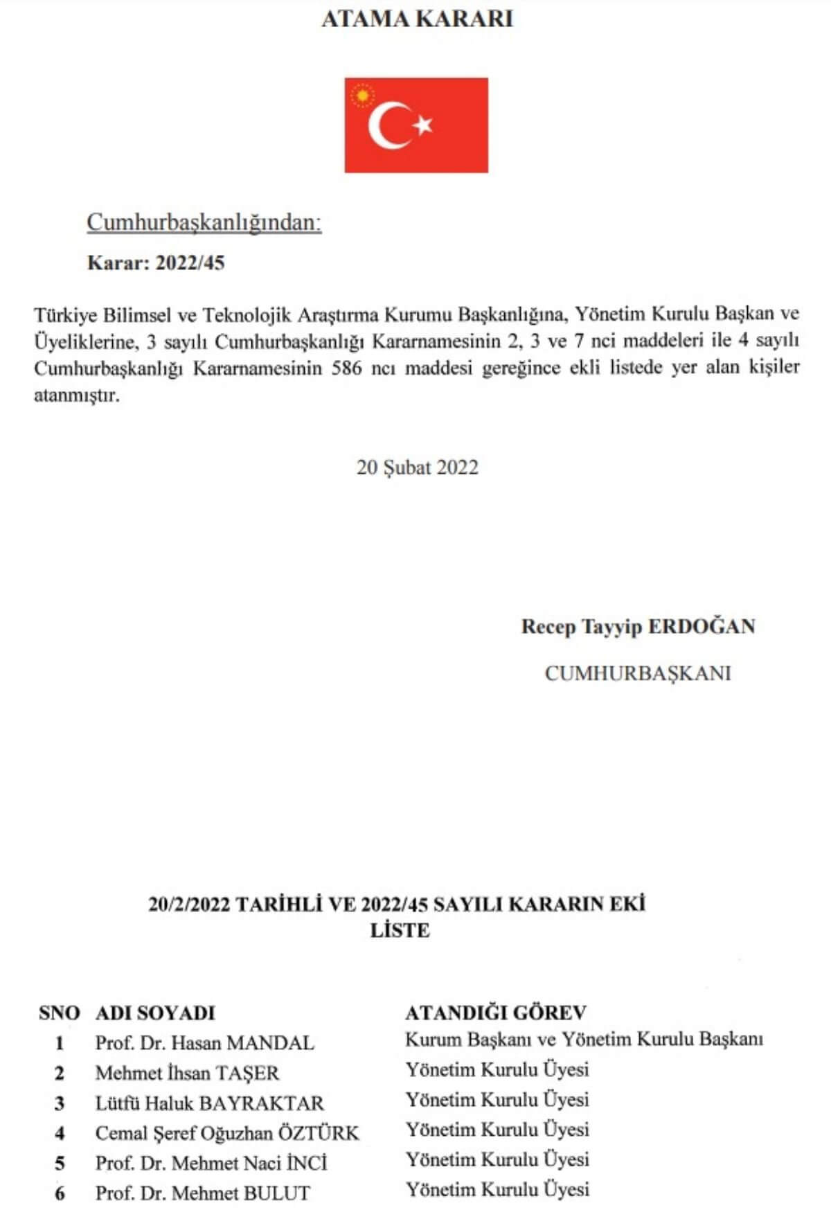 Resmi Gazete’de yayımlanan karara göre TÜBİTAK Kurum Başkanı ve Yönetim Kurulu Başkanı olarak Prof. Dr. Hasan Mandal görevine devam ederken, Yönetim Kurulu Üyeleri Mehmet İhsan Taşer, Lütfü Haluk Bayraktar, Cemal Şeref Oğuzhan Öztürk, Prof. Dr. Mehmet Bulut, Prof. Dr. Mehmet Naci İnci oldu.