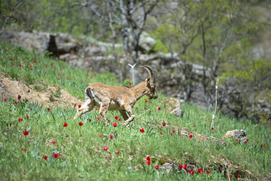 Nesli tükenme tehlikesi altında olduğu için koruma altında alınan ve avlanması yasak olan yaban keçileri, ilkbaharın gelişiyle otlakların yeşerdiği Munzur Vadisi Milli Parkı’nda otlanırken görüntülendi.