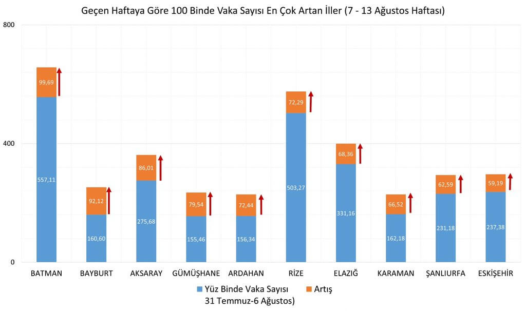 Koca’nın açıklamasına göre; son bir haftada vaka sayısı en çok artan iller Batman, Bayburt, Aksaray, Gümüşhane ve Ardahan oldu. Bakan Koca, “Aşı ile bağışıklık kazanana kadar tedbirlere tam uyum şart. Maske, Mesafe ve Temizlik olmazsa olmaz” mesajını paylaştı.