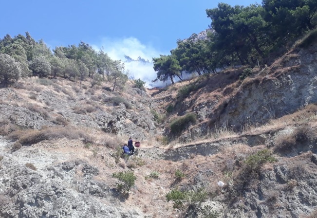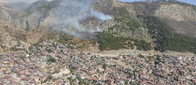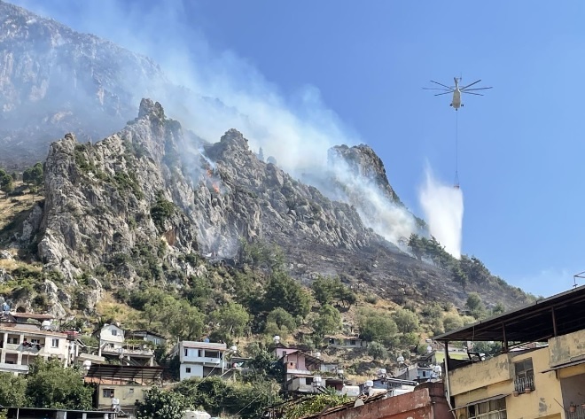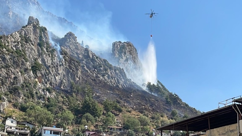 Çevredekilerin ihbarı üzerine bölgeye Orman Bölge Müdürlüğü’ne bağlı helikopter ve arazözler sevk edildi. Ekiplerin yangına müdahalesi sürüyor.