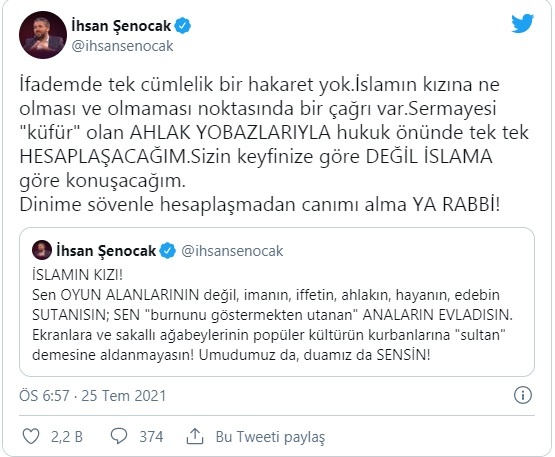 Paylaşımı ile büyük tepki çeken Şenocak, gelen eleştirilere “hesaplaşacağım” diyerek tepki gösterdi. Şenocak’ın eleştirilere cevap olarak attığı tweet şu şekilde: “İfademde tek cümlelik bir hakaret yok.İslamın kızına ne olması ve olmaması noktasında bir çağrı var.Sermayesi “küfür” olan AHLAK YOBAZLARIYLA hukuk önünde tek tek HESAPLAŞACAĞIM.Sizin keyfinize göre DEĞİL İSLAMA göre konuşacağım. Dinime sövenle hesaplaşmadan canımı alma YA RABBİ!”