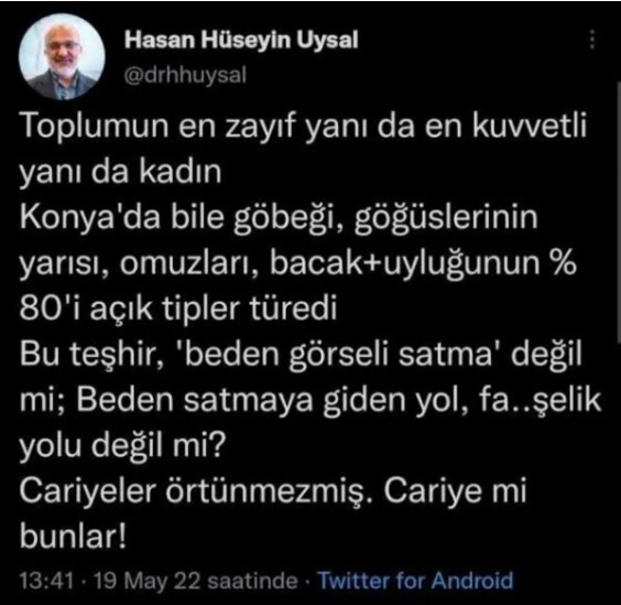 Kıyafet tercihleri nedeniyle kadınlara yönelik cinsiyetçi ifadeler kullanan Uysal, “Toplumun en zayıf yanı da en kuvvetli yanı da kadın. Konya’da bile göbeği, göğüslerinin yarısı, omuzları, bacak uyluğunun yüzde 80’i açık tipler türedi. Bu teşhir, ‘beden görseli satma’ değil mi? Beden satmaya giden yol, fahişelik yolu değil mi? Cariyeler örtünmezmiş. Cariye mi bunlar!” dedi.