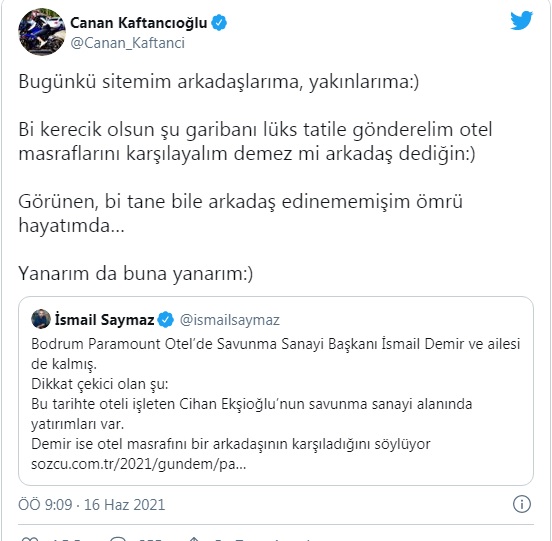 Canan Kaftancıoğlu, Twitter’dan İsmail Saymaz’ın İsmail Demir’le yaptığı söyleşiyi alıntılayarak, “Bugünkü sitemim arkadaşlarıma, yakınlarıma. Bi kerecik olsun şu garibanı lüks tatile gönderelim otel masraflarını karşılayalım demez mi arkadaş dediğin. Görünen, bi tane bile arkadaş edinememişim ömrü hayatımda” diye espri yaptı.
