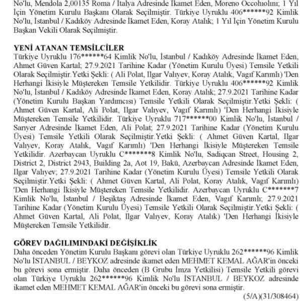 Sözcü’den Emre Deveci’nin haberine göre, Mehmet Ağar’ın yerine Yönetim Kurulu Başkanı olarak İtalya uyruklu Moreno Occohiolini atandı. Mehmet Ağar’ın ayrıldığı yönetim kurulu üyeliğine ise Ahmet Güven Kartal getirildi.