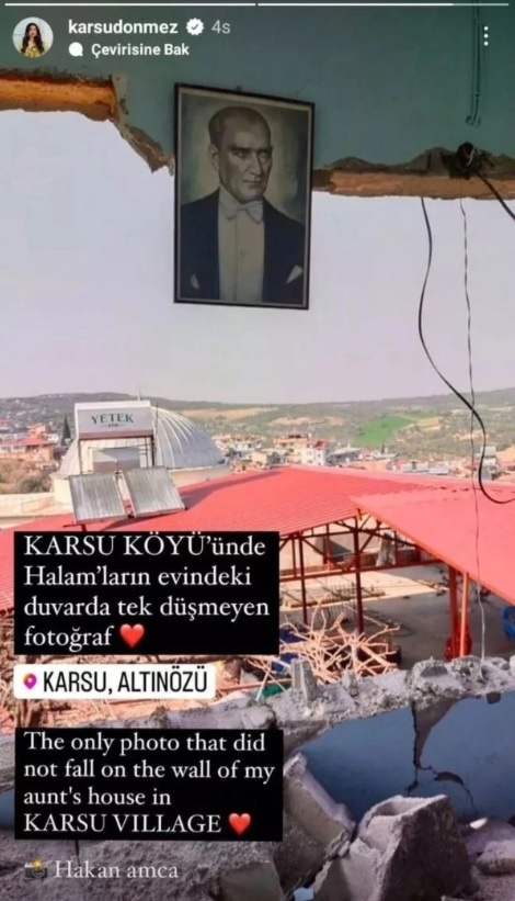 Hollanda’da yaşayan Karsu’nun paylaşımında Mustafa Kemal Atatürk’e ait bir fotoğrafın depremde hasar görmeden duvara asılı bir şekilde kaldığı görülüyor.