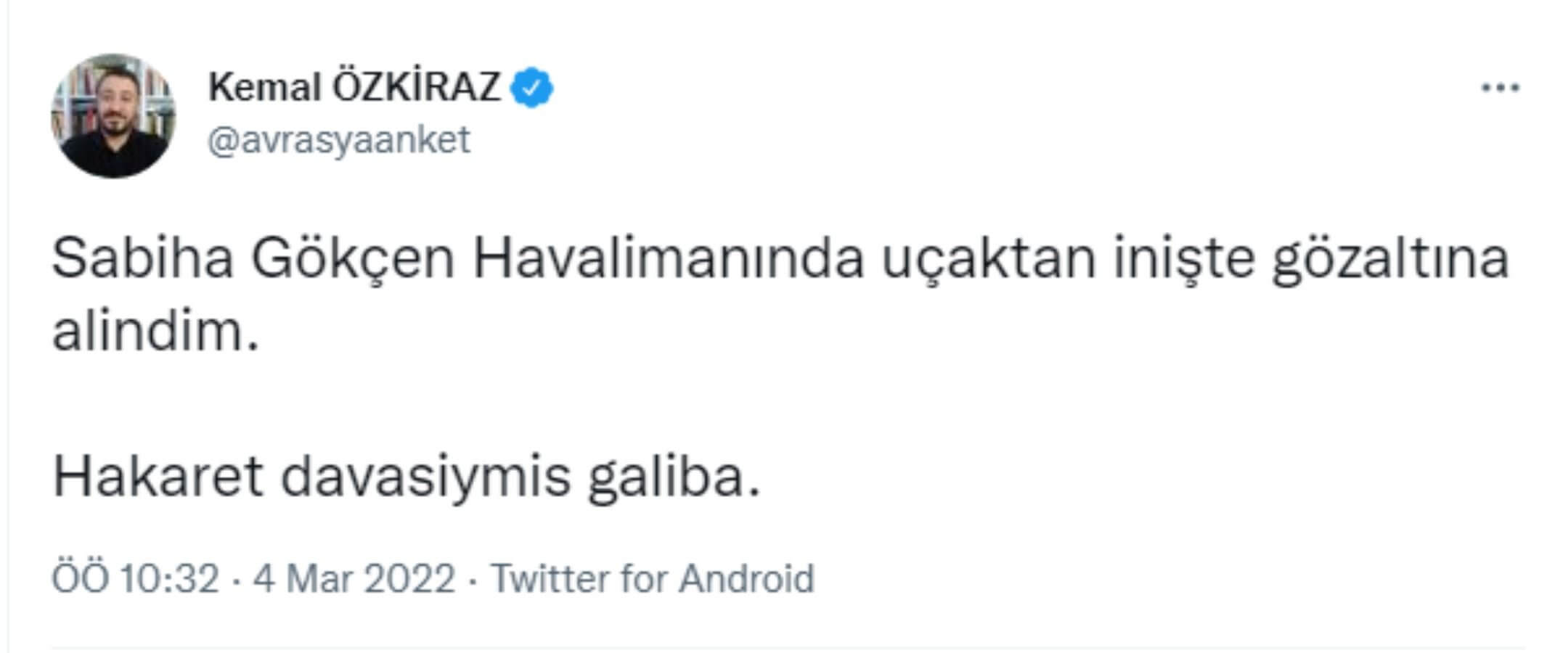 Bugün sosyal medya hesabından yeni paylaşım yapan Özkiraz, ”Sabiha Gökçen Havalimanı’nda uçaktan inişte gözaltına alındım. Hakaret davasıymış galiba” ifadelerine yer verdi.