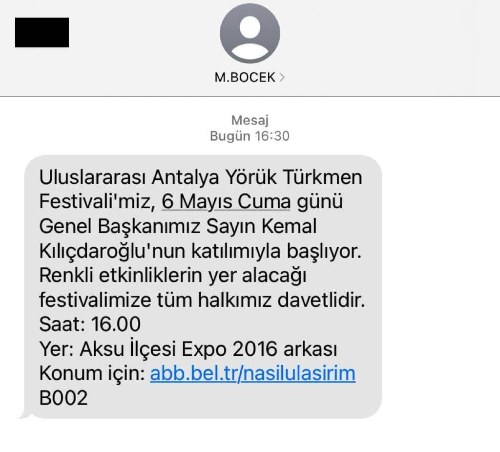 Antalya Büyükşehir Belediye Başkanı Muhittin Böcek, önceki gün gönderdiği toplu SMS mesajında şu ifadeleri kullanmıştı: “Uluslararası Antalya Yörük Türkmen Festivali’miz 6 Mayıs Cuma günü Genel Başkanımız Sayın Kemal Kılıçdaroğlu’nun katılımıyla başlıyor. Renkli etkinliklerin yer alacağı festivalimize tüm halkımız davetlidir.”