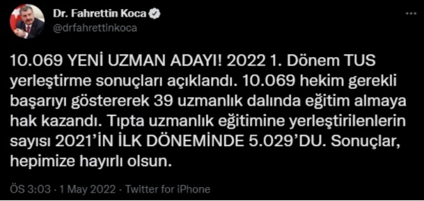 “2022 1. Dönem TUS yerleştirme sonuçları açıklandı. 10 bin 69 hekim gerekli başarıyı göstererek 39 uzmanlık dalında eğitim almaya hak kazandı. Tıpta uzmanlık eğitimine yerleştirilenlerin sayısı 2021’in ilk döneminde 5 bin 29’du. Sonuçlar, hepimize hayırlı olsun.”
