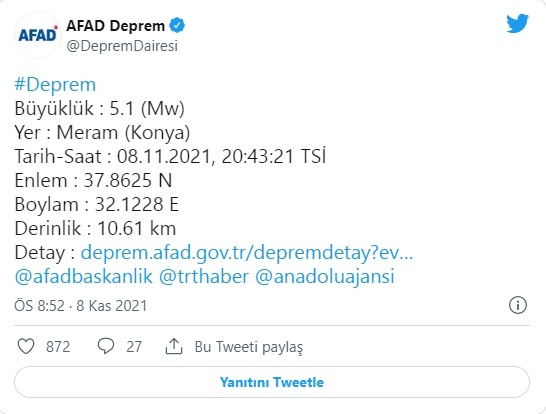 AFAD verilerine göre, Konya’nın  Meram ilçesinde saat 20.43’te 5,1 büyüklüğünde deprem meydana geldi.