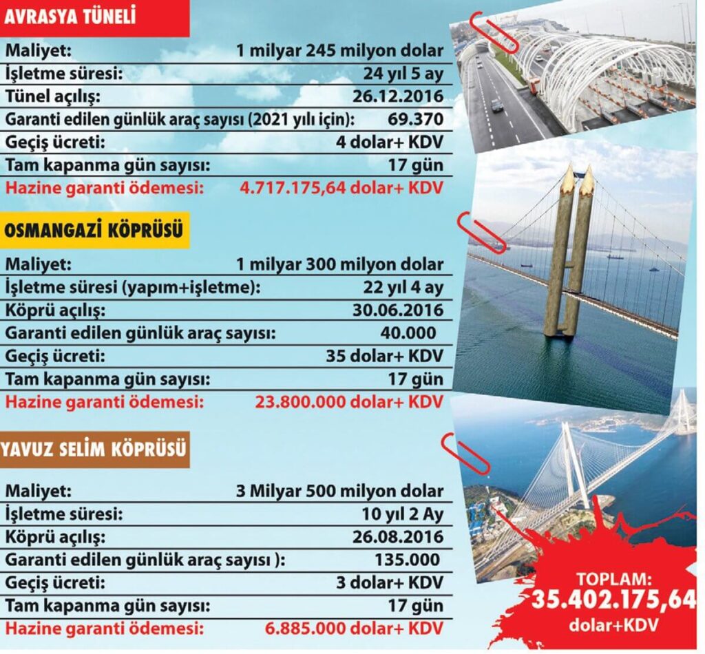 Tam kapanma dolayısıyla vatandaş geçim derdine düştü.  Ancak, müteahhitlerin keyfi yerinde… Geçiş garantili köprü ve tüneller nedeniyle Hazine’den 35 milyon 402 bin dolar daha çıkacak. 17 günlük kapanma süresince, Osmangazi ve Yavuz Sultan Selim köprüleri ile Avrasya Tüneli’nden araç geçmeyecek ama toplam 4 milyonu aşkın araç geçmiş gibi, müteahhitlere ödeme yapılacak. Hazine, Yavuz Sultan Selim Köprüsü için 6 milyon 885 bin, Osmangazi Köprüsü için 23 milyon 800 bin ve Avrasya Tüneli için 4 milyon 717 bin dolar ödeyecek.