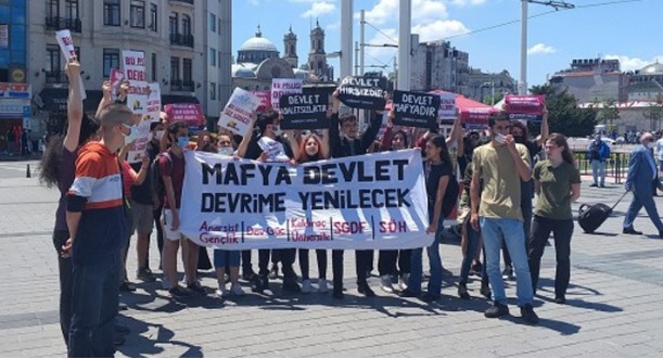 “Mafya-çete devletine hayır” ve “Bu pisliği ancak gençlik temizler” sloganları atan grup, “Mafya devlet, devrime yenilecek” pankartı açtı.