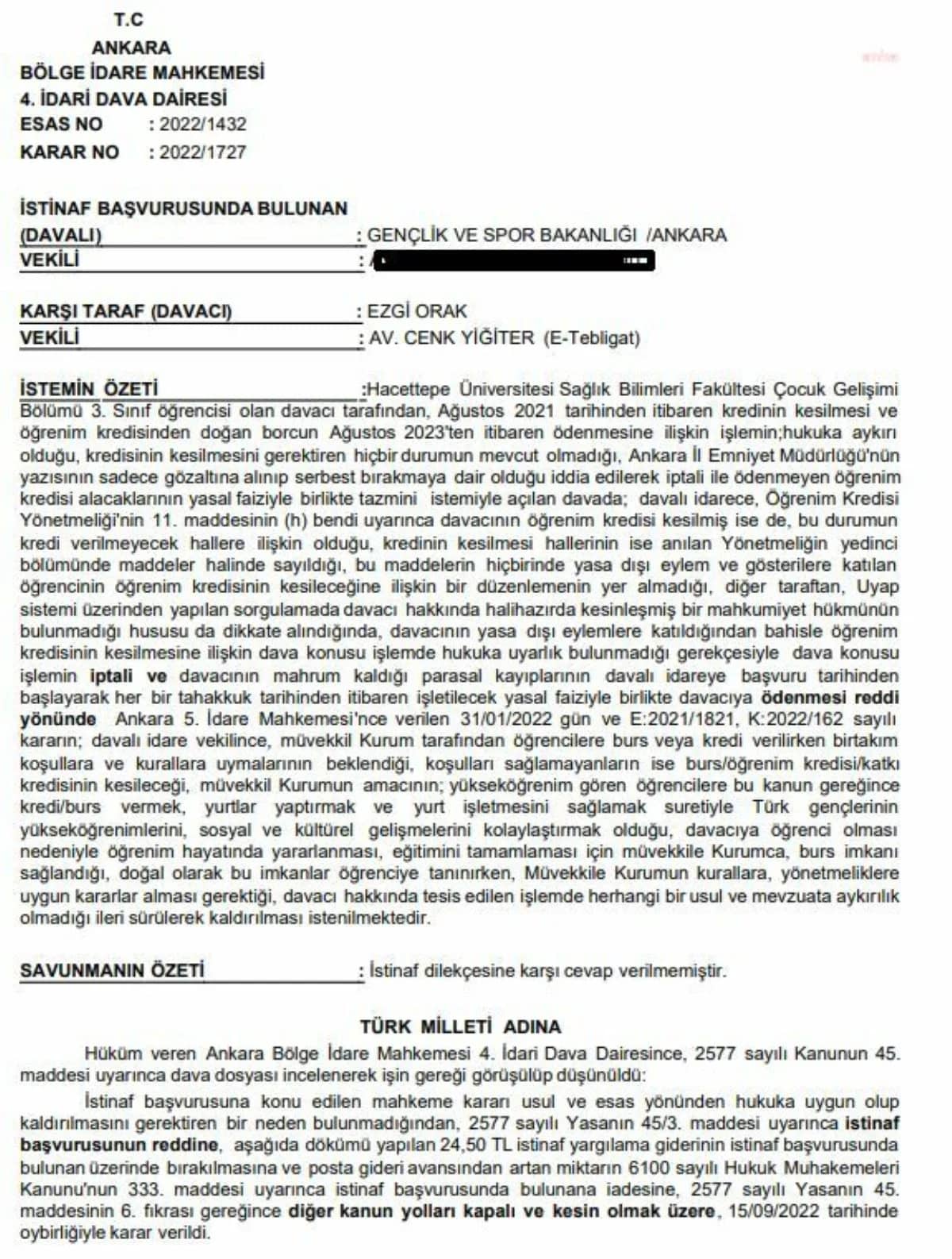 Ankara İl Emniyet Müdürlüğü’nün Kredi ve Yurtlar Kurumu’na yazdığı yazı sonucu öğrenim kredisi kesilen Hacettepe Üniversitesi Sağlık Bilimleri Fakültesi Çocuk Gelişimi Bölümü öğrencisi Ezgi Orak’ın Gençlik ve Spor Bakanlığı hakkında işlemin iptali istemiyle açtığı dava kesinleşti. Ankara Bölge İdare Mahkemesi 4. İdari Dava Dairesi, Bakanlığın istinaf talebini reddederek, karara itiraz yolunun kapalı olduğunu bildirdi.
