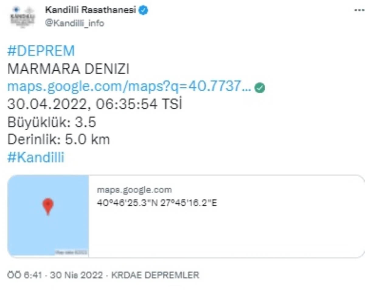 Kandilli Rasathanesi’nde yer alan bilgilere göre, Marmara Denizi’nde 3,5 büyüklüğünde deprem oldu.