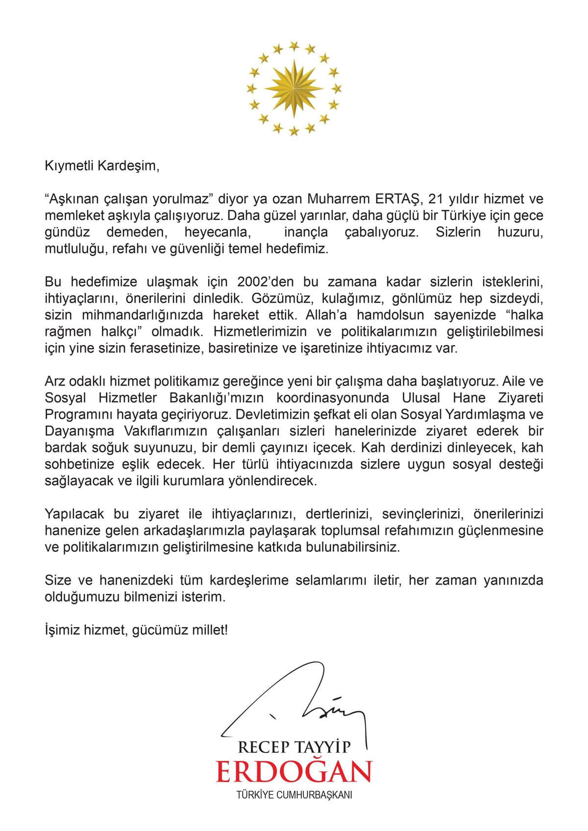 Sözcü’nün aktardığına göre; mektupta, “Yapılacak bu ziyaret ile ihtiyaçlarınızı, dertlerinizi, sevinçlerinizi, önerilerinizi hanenize gelen arkadaşlarımızla paylaşarak toplumsal refahın güçlenmesine ve politikalarımızın geliştirilmesine katkıda bulunabilirsiniz” ifadeleri yer alıyor.