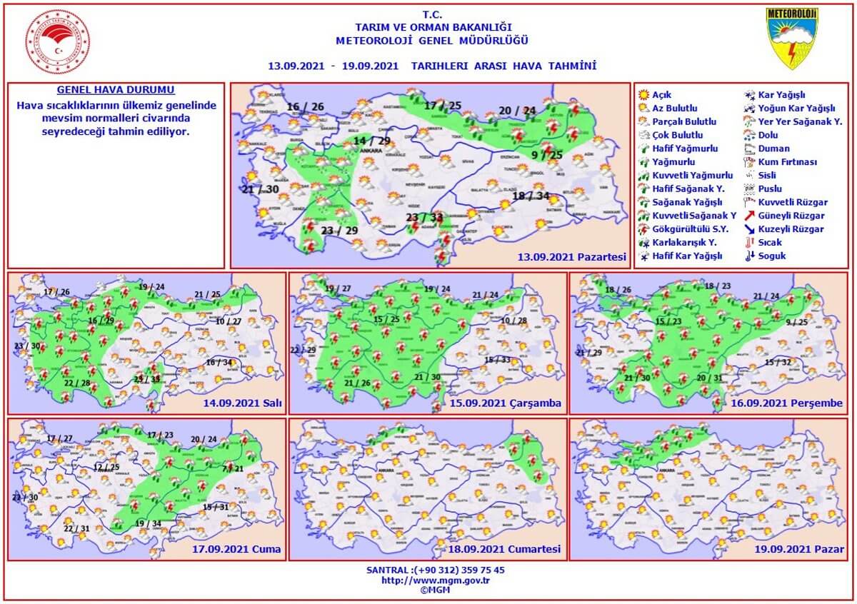 Meteoroloji Genel Müdürlüğü tarafından yapılan son değerlendirmelere göre, ülkenin iç ve batı kesimleri ile Doğu Akdeniz’in parçalı ve yer yer çok bulutlu, Orta ve Doğu Karadeniz kıyıları, Batı Akdeniz’in iç kesimleri ile Afyonkarahisar, Kütahya, Bursa’nın güneyi, Eskişehir, Ankara’nın kuzey ve batısı, Sinop, Osmaniye, Hatay’ın batısı, Doğu Akdeniz’in Toroslar kesimi, Konya’nın batı ilçeleri, Erzurum, Kars ve Ardahan çevrelerinin sağanak ve gök gürültülü sağanak yağışlı, diğer yerlerin az bulutlu ve açık geçeceği tahmin ediliyor.