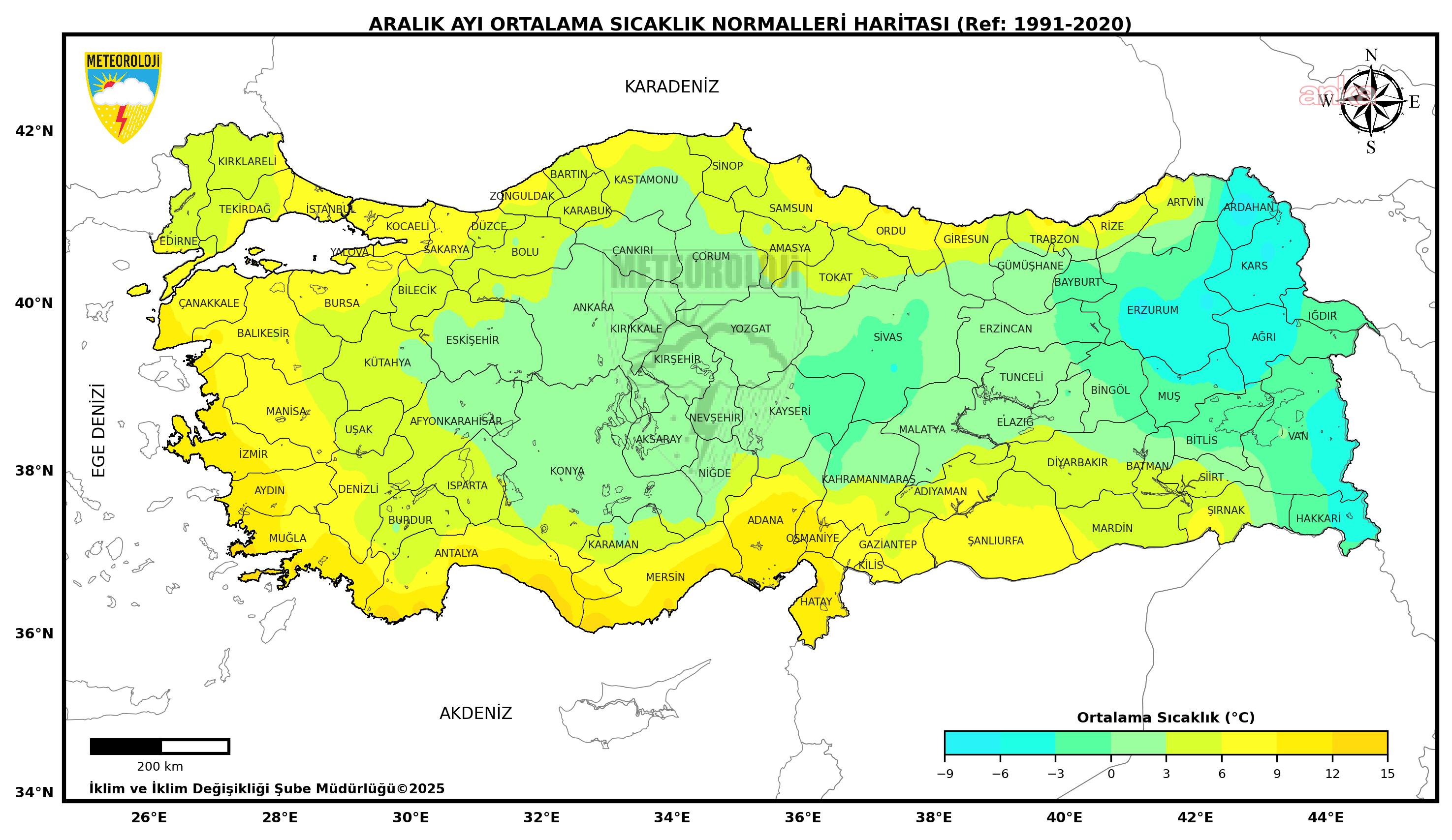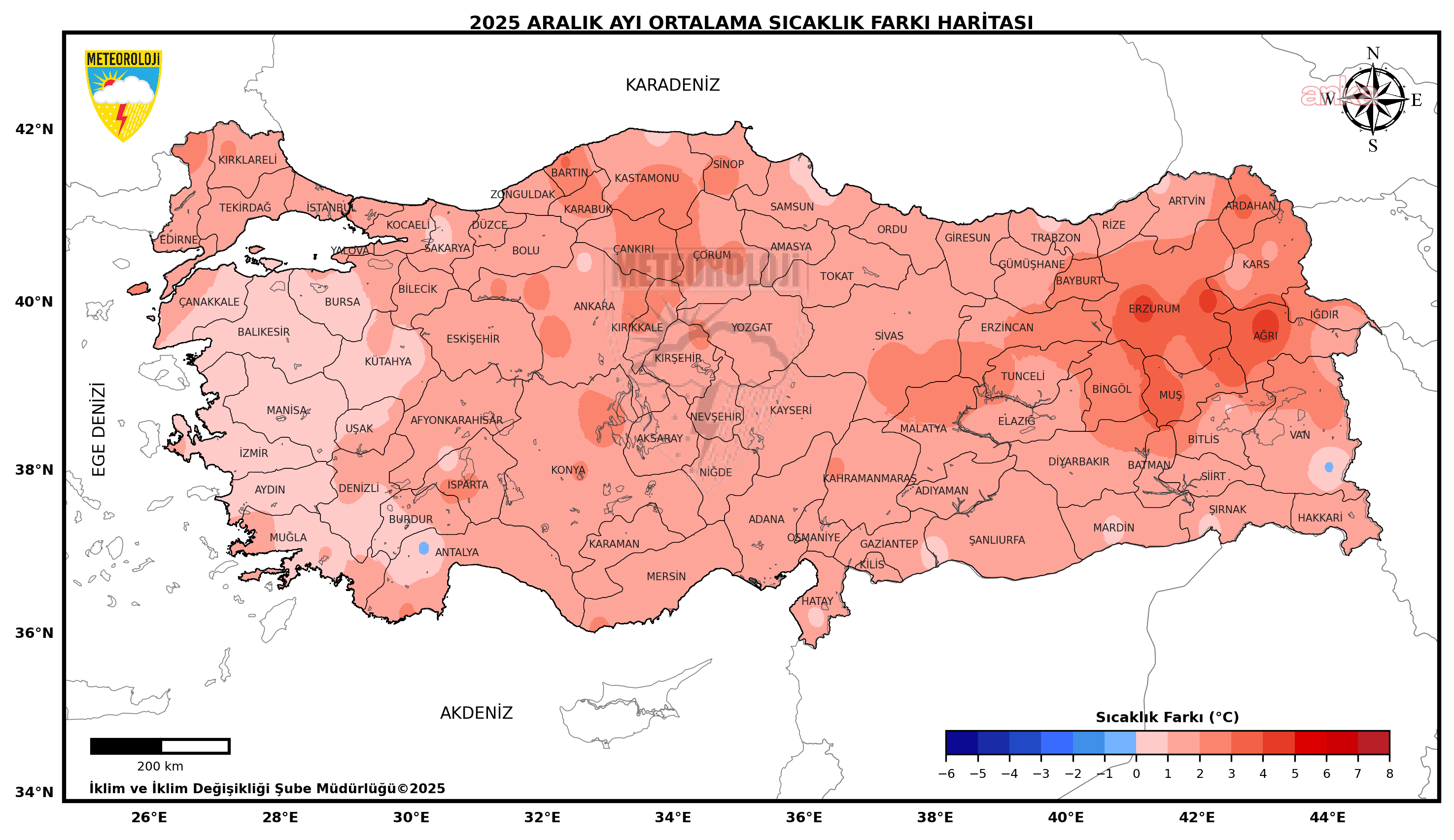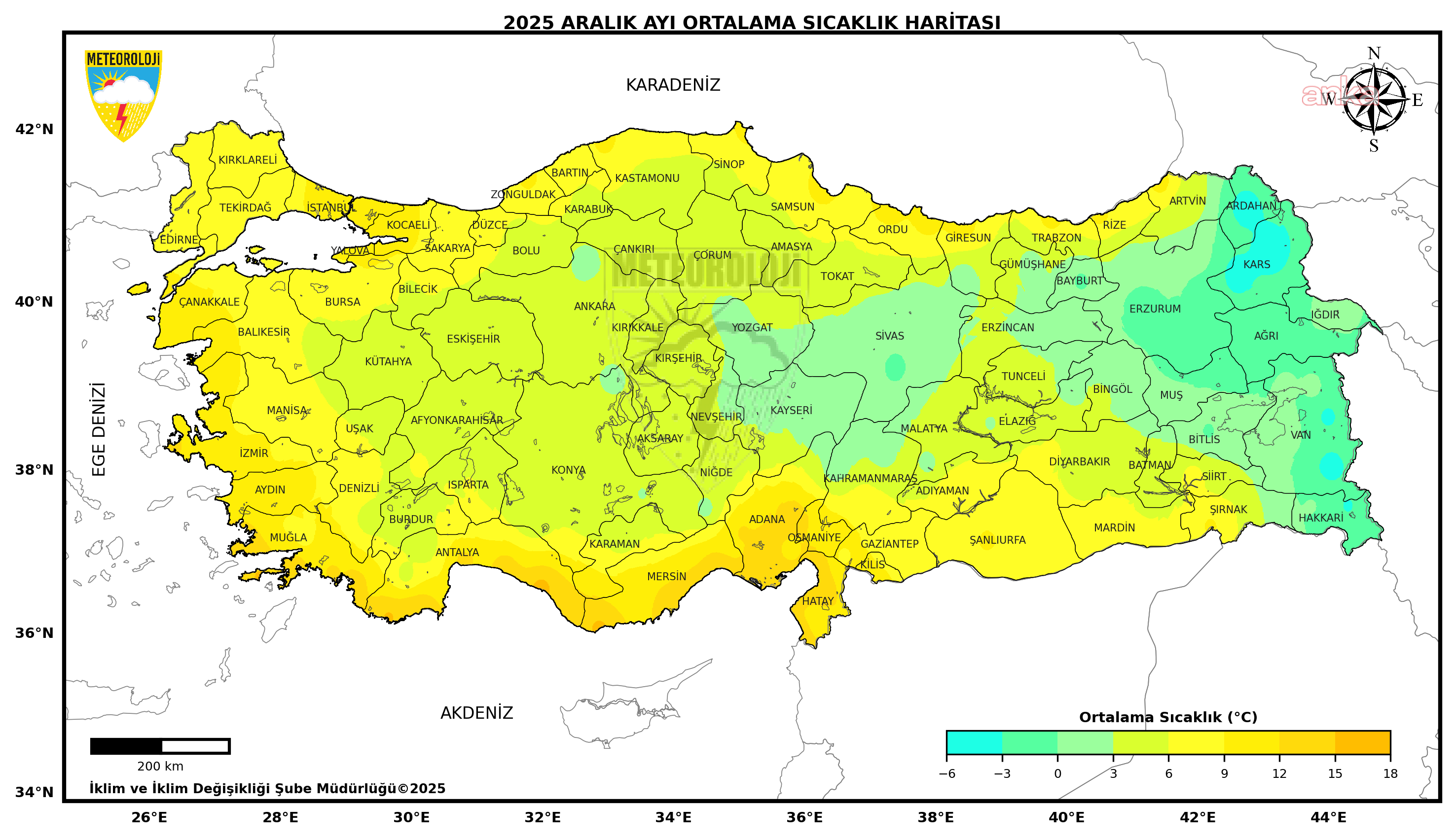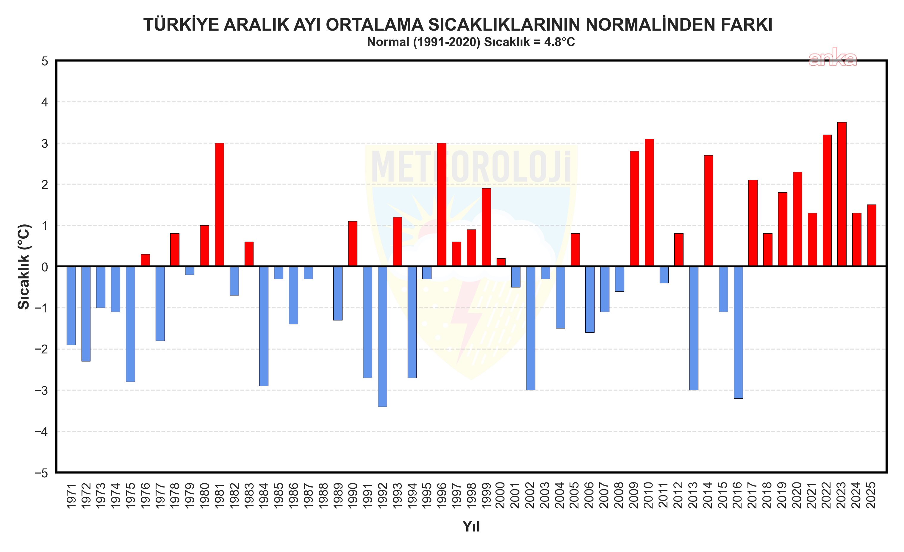 MGM’nin analizine göre, 1991-2020 normalleri aralık ayı ortalama sıcaklığı 4,8 derece iken, 2025 Aralık ayı 6,3 derece olarak kayıtlara geçti. 2025 yılı Aralık ayı, son 55 yılın en sıcak 12’inci aralık ayı olarak yaşandı. Aralık ayında en düşük sıcaklık sıfırın altında 25,7  derece olarak Özalp’te, en yüksek sıcaklık ise 25,6 derece ile İskenderun’da tespit edildi.