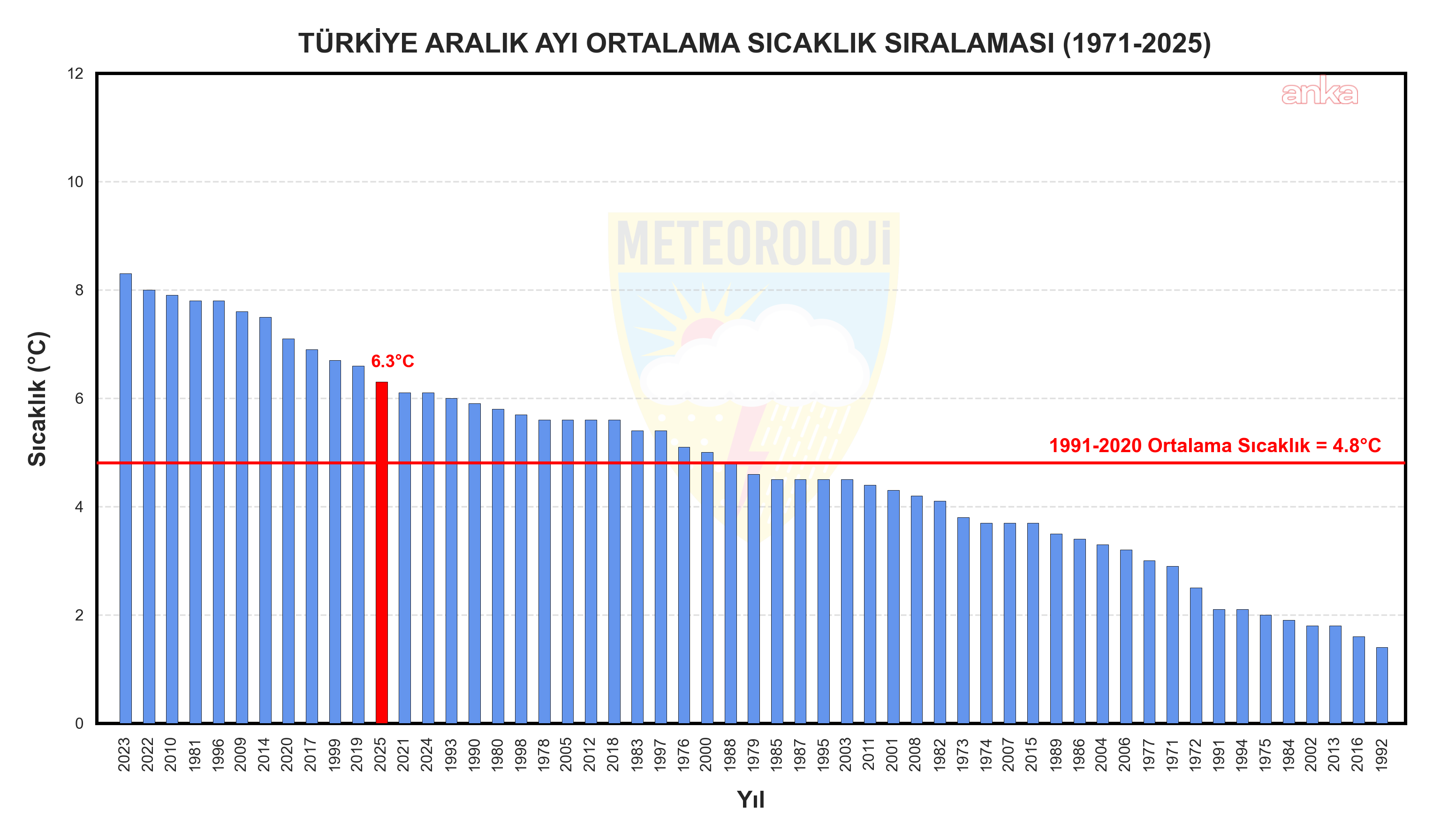 Meteoroloji Genel Müdürlüğü (MGM), aralık ayının 1991-2020 sıcaklık analizine göre, Türkiye'de 2025 yılı aralık ayı ortalama sıcaklığı 6,3 derece ile mevsim normallerinin 1,5 derece üzerinde kaydedildi. 2025 aralık ayı, son 55 yılın en sıcak 12'nci aralık ayı olarak kayıtlara geçti.