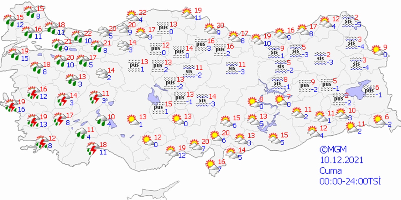 Meteoroloji Genel Müdürlüğü tarafından yapılan son değerlendirmelere göre; Marmara, Ege, Batı Akdeniz, Eskişehir çevreleri, Konya’nın batısı, Ankara’nın batısı ve kuzeyi, Bolu, Düzce, Zonguldak ve Bartın çevrelerinin Sağanak ve gök gürültülü sağanak yağışlı geçeceği tahmin ediliyor. Yağışların Marmara’nın batısı ve güneyi ile İstanbul çevrelerinde, Ege Bölgesi ile Antalya ve Burdur çevrelerinde yerel kuvvetli, Kıyı Ege’de çok kuvvetli, Muğla’nın kıyı kesimlerinde yer yer şiddetli olması bekleniyor. Rüzgarın batı kesimlerde güney yönlerden Fırtına şeklinde eseceği tahmin ediliyor.