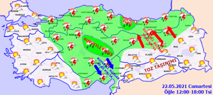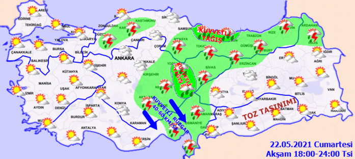 Yağışların; Batı Karadeniz’in iç kesimleri ile Çankırı, Kayseri, Nevşehir, Kırşehir, Kırıkkale, Çorum, Ordu, Giresun ve Sivas çevrelerinde yer yer kuvvetli olması bekleniyor. Şanlıurfa, Mardin, Diyarbakır, Batman, Elazığ, Tunceli, Bingöl, Muş, Siirt ve Şırnak çevrelerinde toz taşınımı beklenmektedir.