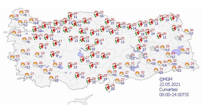 Meteoroloji Genel Müdürlüğü tarafından yapılan son değerlendirmelere göre; ülkemiz genelinin parçalı, yer yer çok bulutlu, Marmara’nın doğusu, Doğu Akdeniz, İç Anadolu, Karadeniz, Doğu Anadolu’nun kuzeyi ile Kütahya ve Afyonkarahisar çevrelerinin yerel olmak üzere aralıklı sağanak ve gök gürültülü sağanak yağışlı geçeceği tahmin ediliyor.