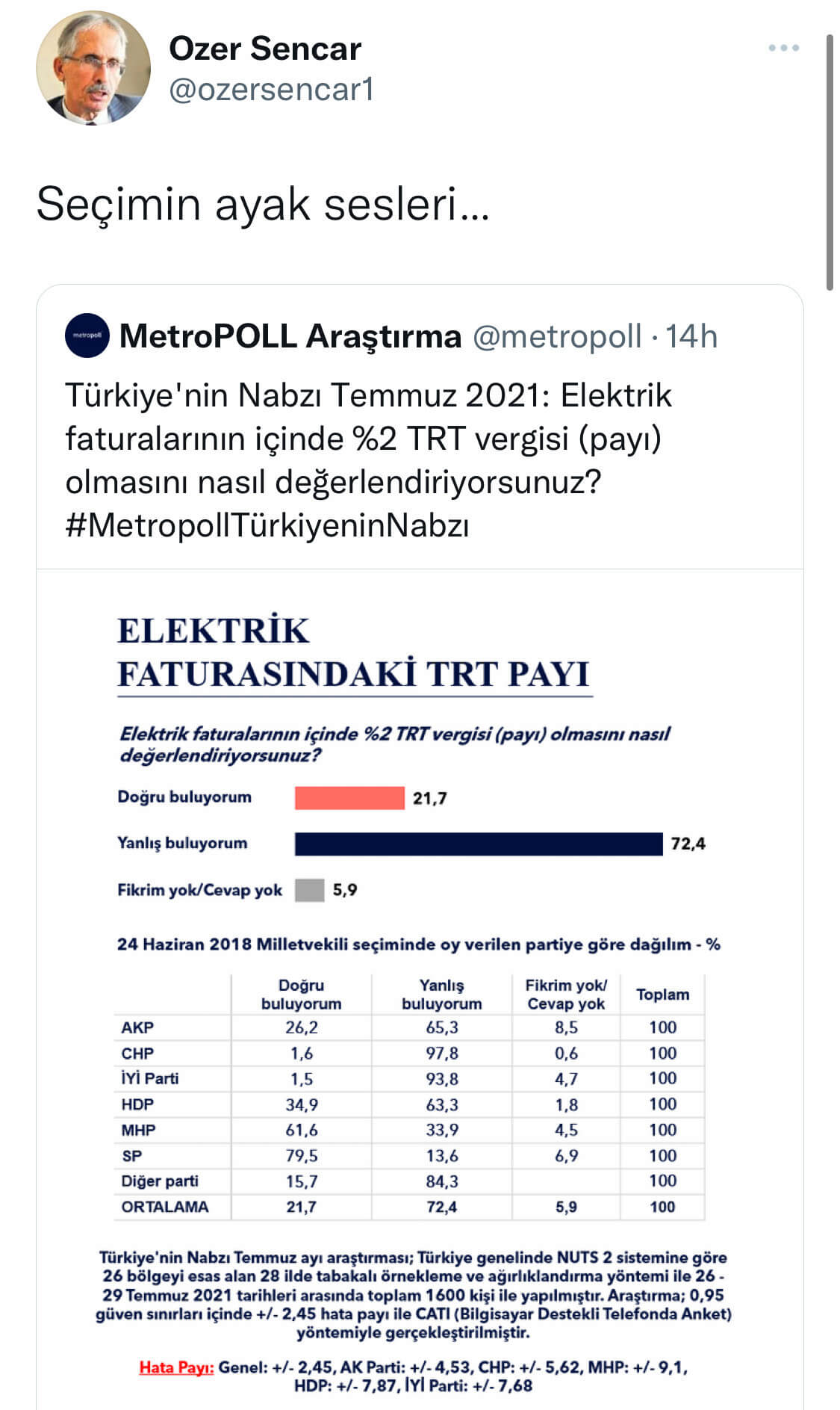 MetroPOLL Araştırma'nın Kurucusu ve Yöneticisi Özer Sencar, Temmuz ayında gerçekleştirdikleri TRT payı ile ilgili anketin sonuçlarını 'seçimin ayak sesleri' yorumuyla sosyal medya hesabından paylaştı.