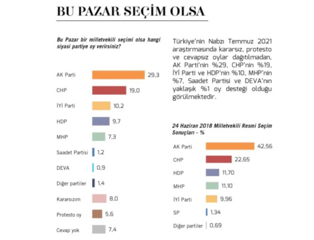 Metropoll’ün Temmuz 2021 Türkiye’nin Nabzı araştırmasının sonuçları belli oldu. Anket, orman yangınları ve sel felaketinden önce, Cumhurbaşkanı Recep Tayyip Erdoğan’ın Diyarbakır seyahatinden sonra yapıldı.